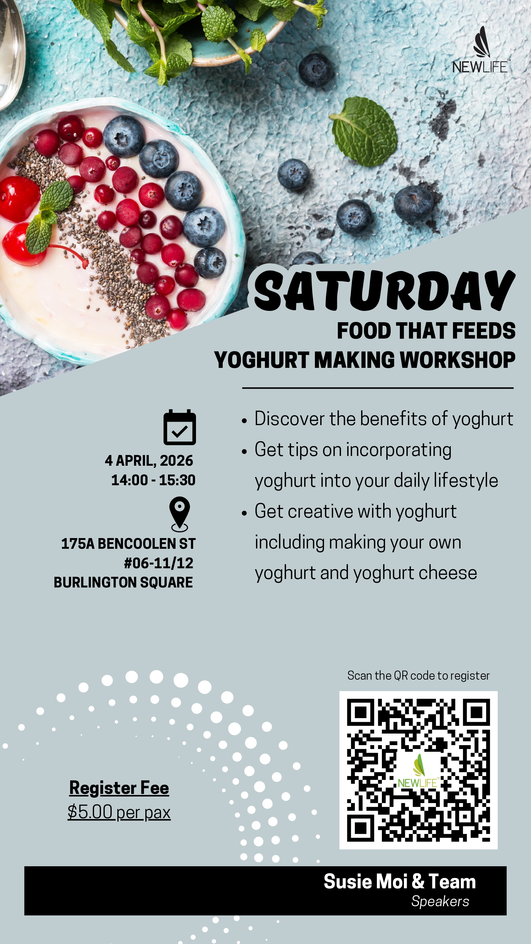 Reserve your seat now! Speaker Manager Team Manager Team Location NewLife™ Singapore 175A Bencoolen Street, #06-11/12, Burlington Square, Singapore 189650 More Info Reserve your seat now! Date Apr 04 2026 Time 2:00 pm - 3:30 pm Labels Singapore Food That Feeds – Yoghurt Making